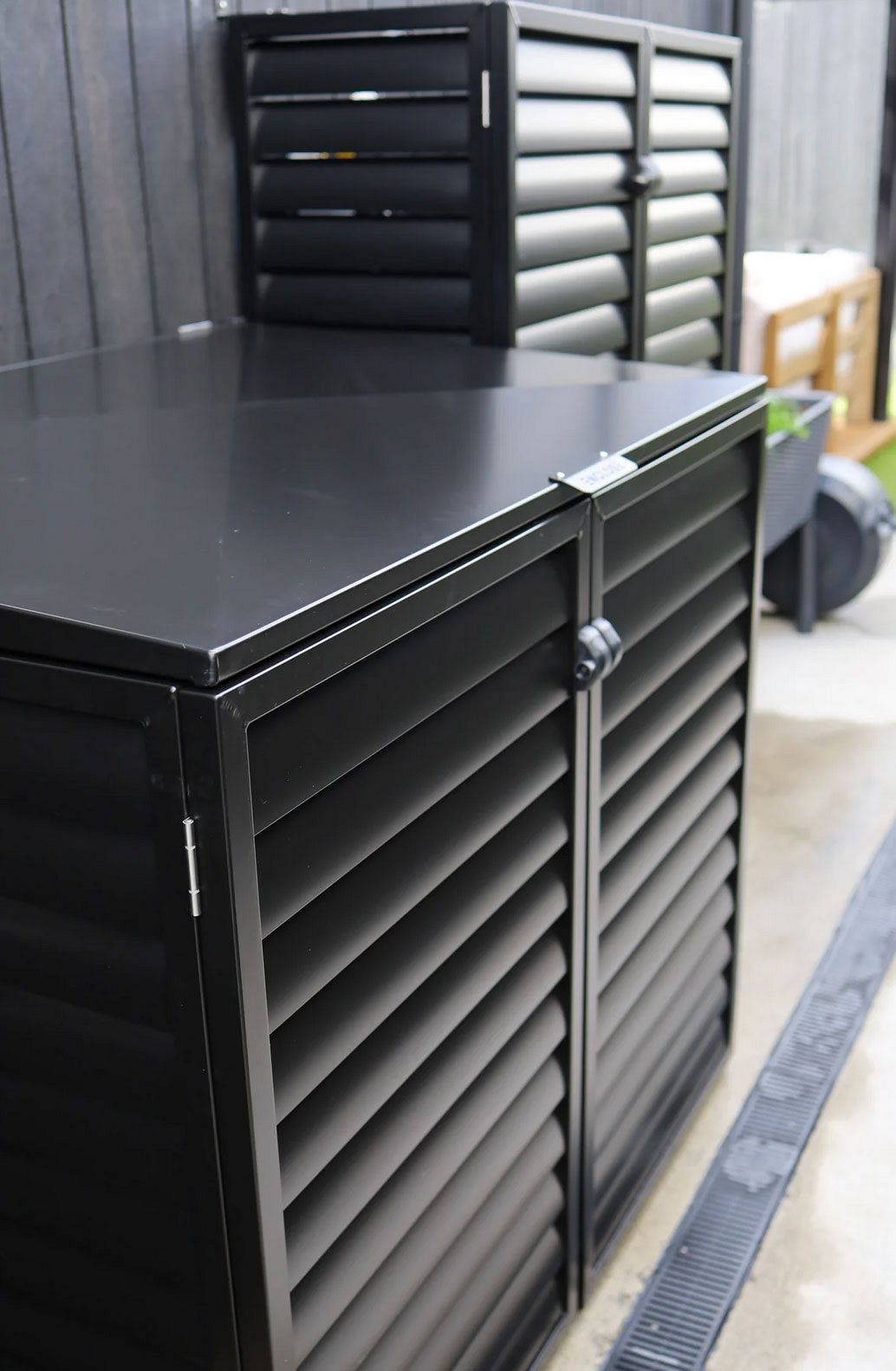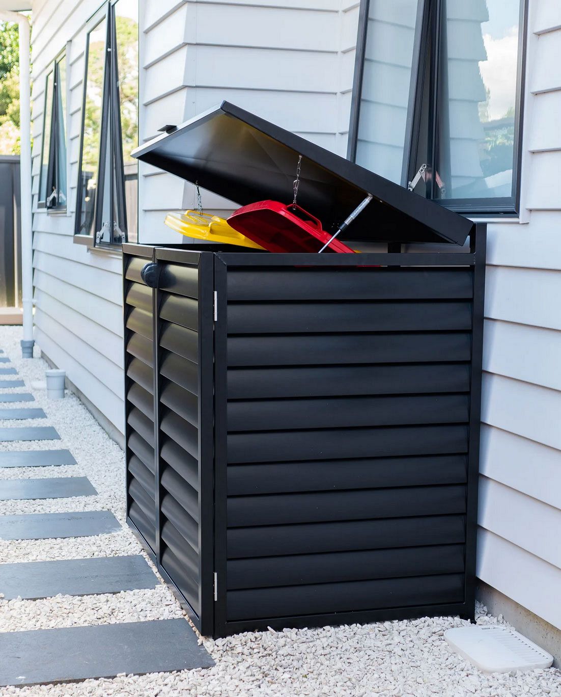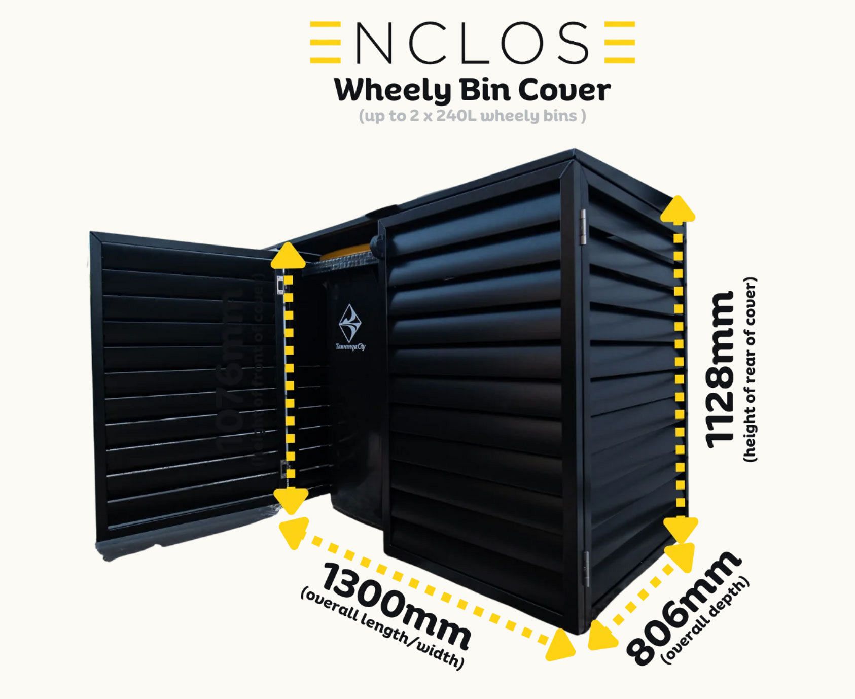 Enclose's premium aluminum bin covers are designed to enclose two 240L bins, featuring a stylish louvre design in your choice of Dulux color. The covers include pre-manufactured louvre panels and a convenient auto bin lifting lid with stainless steel gas struts for easy use.
