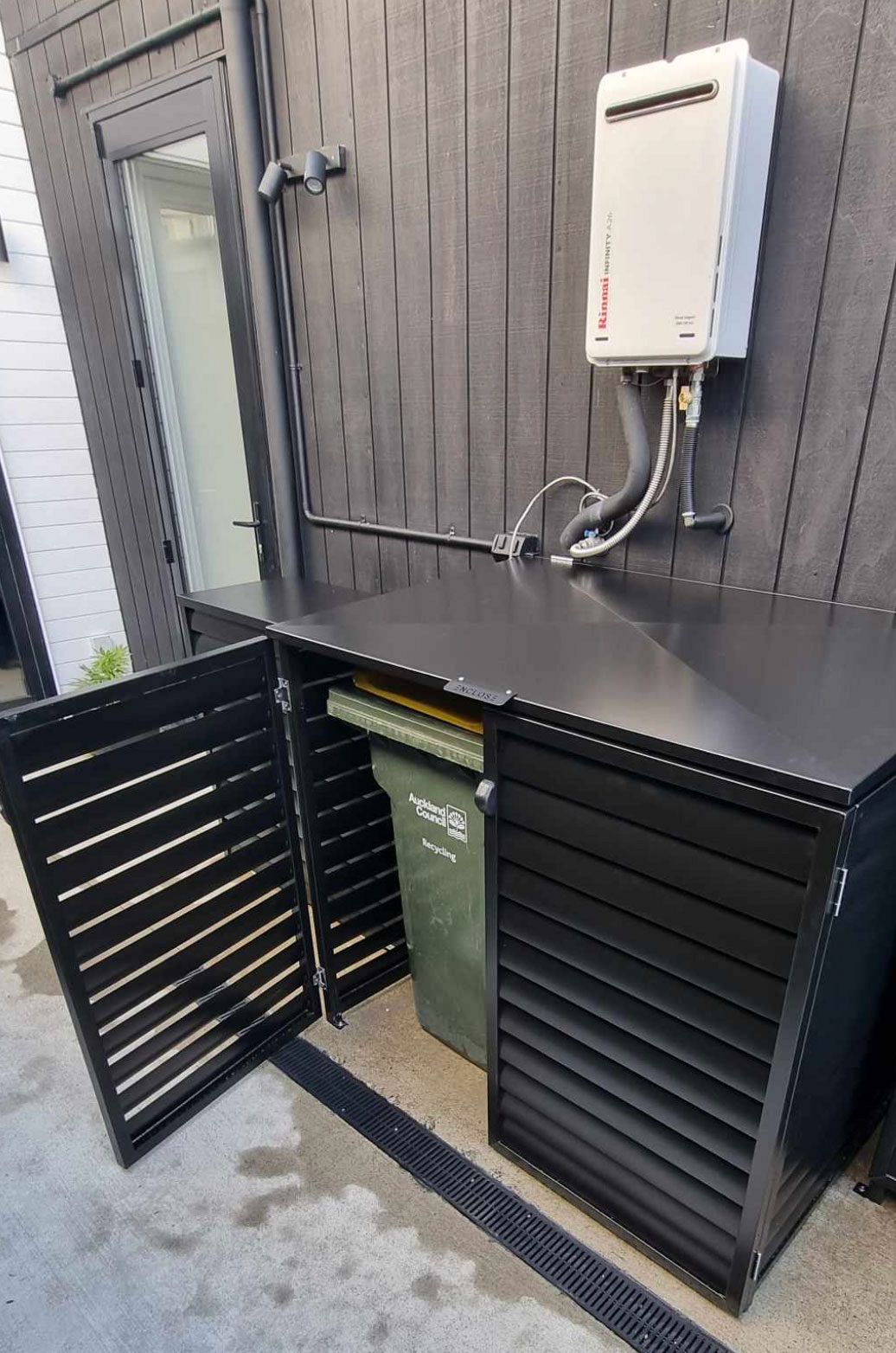 - Hinged Gates and auto bin lifting lid – for easy use of your bins while enclosed.