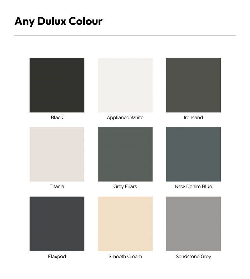 | Dulux, Black, Appliance White, Iron Sand, Titania, Grey Frairs, New Denim Blue, Flaxpod, Smooth Cream and Sandstone Grey |