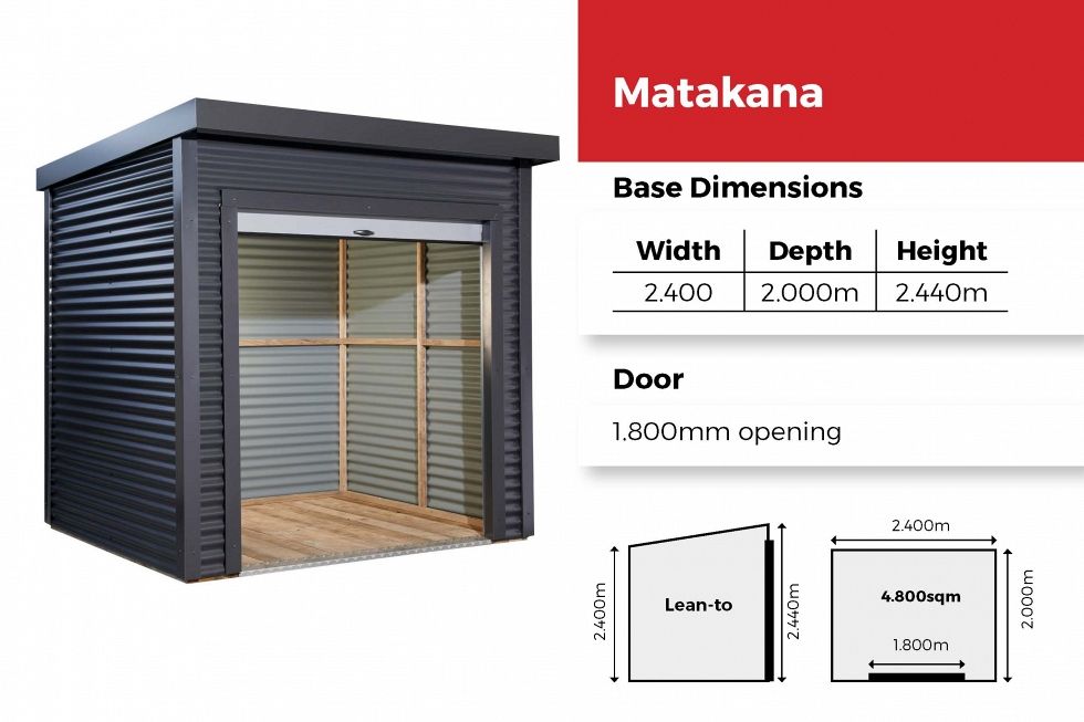 | Duratuf Sheds - Lifestyle Range - Nightfall, Lichen, Green, Thunder Grey, Ironsand, Karaka, Grey, Sandstone Grey, Ebony, Titania, Grey Friars, Mist Green | 2400mm | 2000mm | 2440mm |
