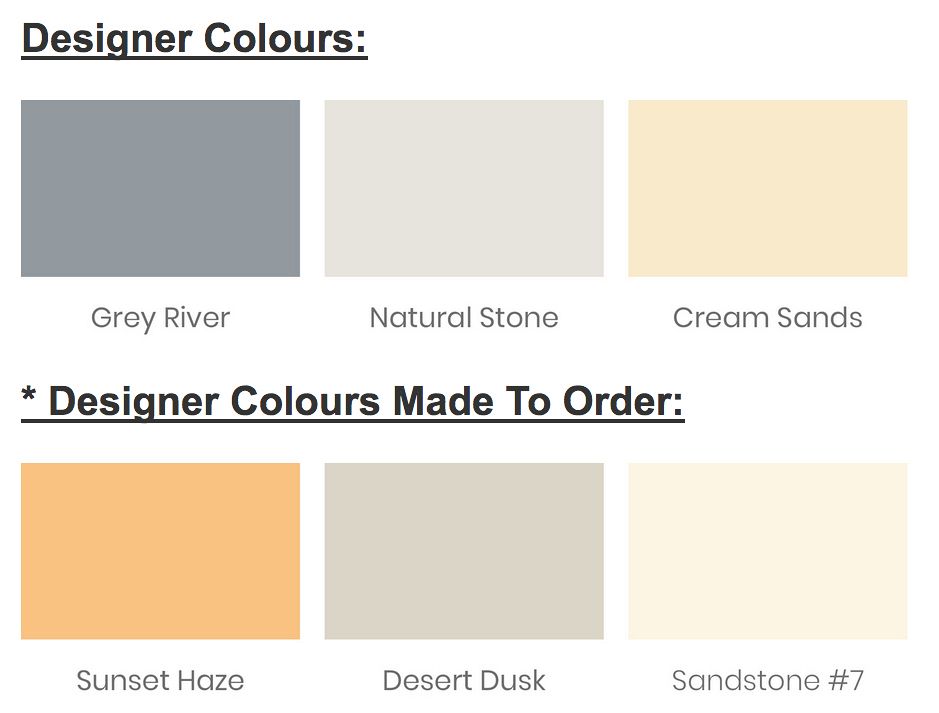 Sunset Haze, Desert Dusk and Sandstone are all made to order. 4x pallets minimium order quantity.