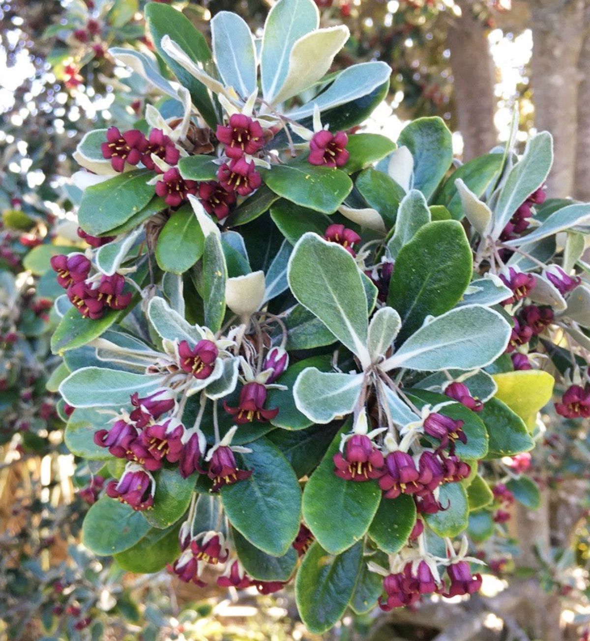 Hardy coastal large shrub or small tree. Leathery dark green leaves felted underneath. Flowers dark crimson to purple. Prefers full sun in free draining soil but will also tolerate dry soil once established. Easily trims to make a very good hedge or can be allowed to grow to a hardy screen. Windy conditions and coastal exposure OK. |